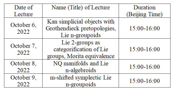 Abstract: In this series of lectures, we'd like to explore higher symplectic stacks in differential geometry with the framework of Lie n-groupoids. We'll talk, in more or less details on,