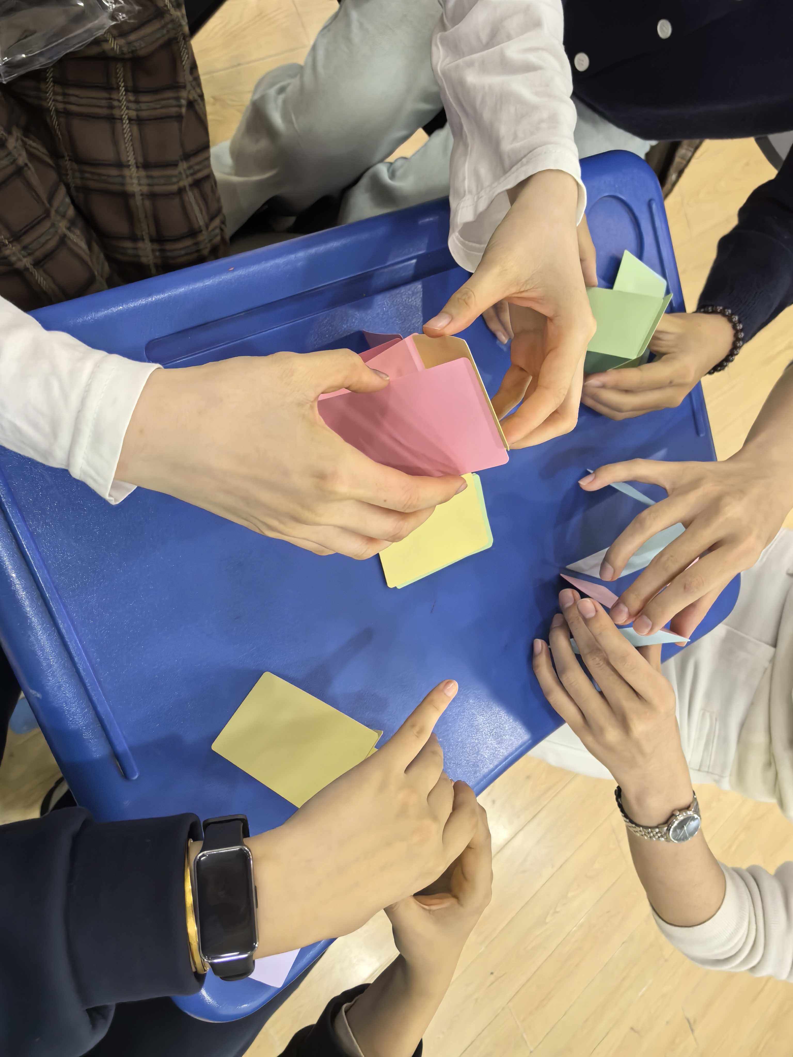 接下来的活动分为“人体字母”、“同舟共济”和“众志成城”三个环节。这些活动的让教室内欢声不断,同学们从最初的拘谨走向默契配合,打破了组内的一些隔阂,培养了团队协作互助的能力,也为后续的交流等活动奠定了良好的基础。