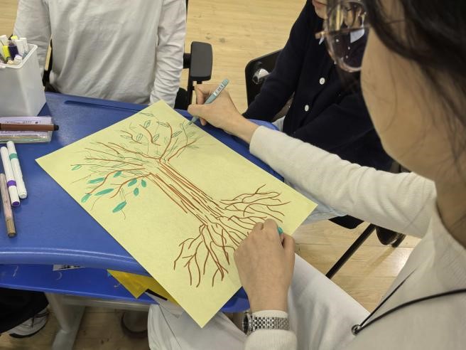 在活动最后组内同学围坐一圈,领取画纸和彩笔,共同绘制独属于每一组的“团体树”。每棵树形态各异,由组内同学一起完成,“团体树”的每一笔都寄托了同学们对未来研究生生活的美好期盼,也象征着大家如树木般不畏风雨、坚定生长,始终心向阳光、生生不息。